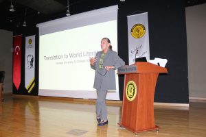 The first talk of the day was delivered by Prof. Dr. Adelheid Rundholz (Johnson C. Smith University, USA). Rundholz presented a comprehensive lecture on the relationship between translation practice and world literature, the dynamics of intercultural circulation, and the role of translation in the formation of literary canons.